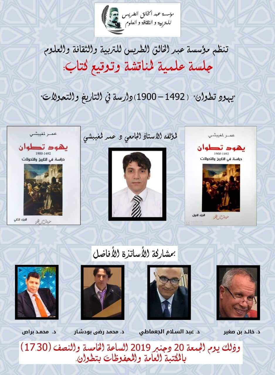 تنظم مؤسسة عبد الخالق الطريس للتربية والثقافة والعلوم جلسة علمية لمناقشة وتوقيع كتاب: “يهود تطوان ( 1492 – 1900): دارسة في التاريخ والتحولات” لمؤلفه الاستاذ الجامعي الدكتور عمر لمغيبشي، وذلك يوم الجمعة 20 دجنبر 2019 على الساعة الخامسة والنصف بالمكتبة العامة والمحفوظات بتطوان.