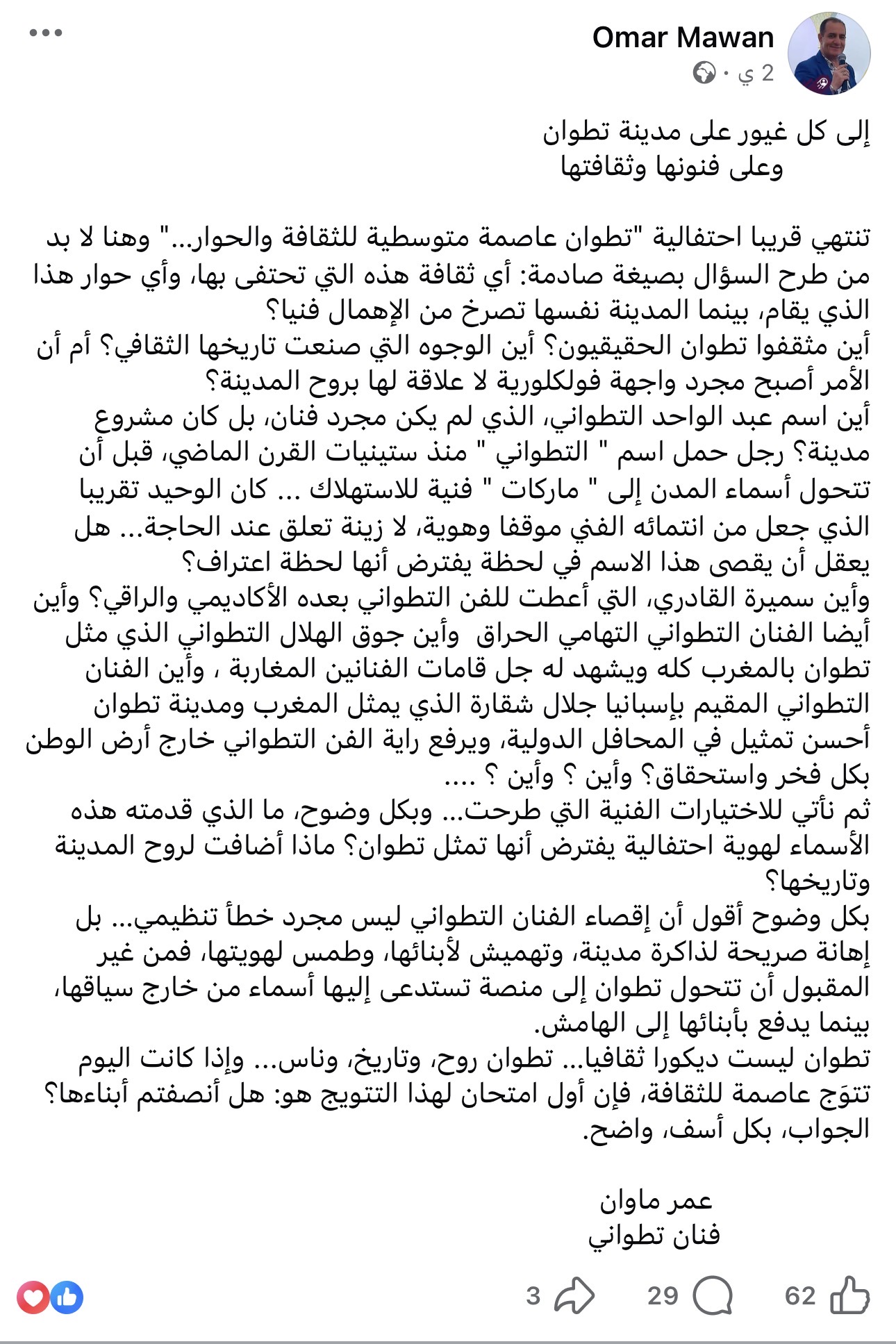 وفي هذا السياق، اعتبر منتقدو البرمجة الفنية أن الاختيارات المعتمدة “لا تعكس بشكل كافٍ روح المدينة ولا تاريخها الثقافي”، مؤكدين أن تظاهرة بهذا الحجم كان من المفترض أن تشكل فرصة للاعتراف بأبناء تطوان وإبراز إسهاماتهم، بدل الاعتماد على أسماء من خارج السياق المحلي.