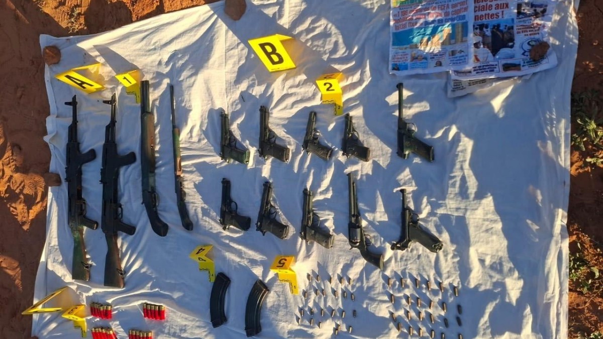 وقد مكنت عمليات التفتيش والتمشيط, التي استغرقت أكثر من ثلاث ساعات تقريبا، من العثور على شحنة من الأسلحة والذخيرة النارية مدفونة في مكان منزو أسفل المرتفع الصخري، كانت ملفوفة في أكياس بلاستيكية وجرائد ورقية منشورة بدولة مالي، من بينها أسبوعيات ورقية صادرة بتاريخ 27 يناير 2025.