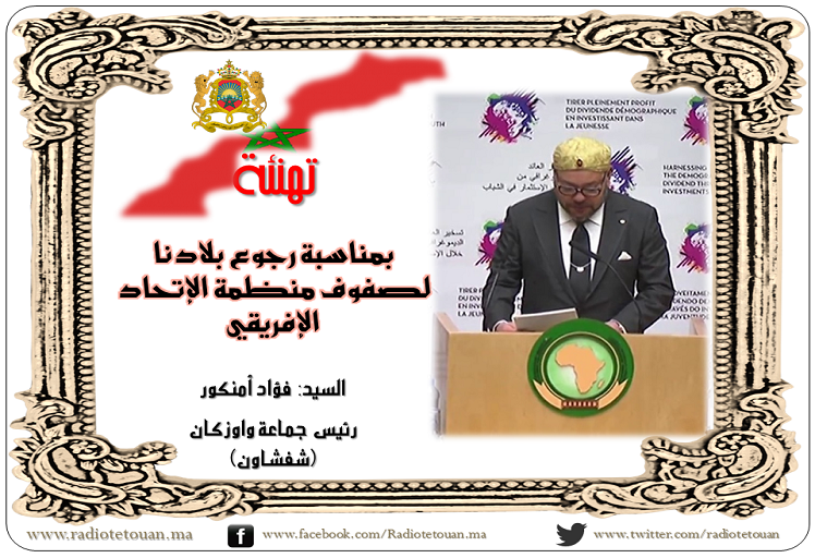 أصالة عن نفسه ونيابة عن أعضاء المجلس وساكنة المنطقة، يتقدم السيد “فؤاد أمنكور” رئيس جماعة واوزكان (شفشاون) إلى حضرة مولاي أمير المؤمنين وسبط الرسول الأمين صاحب الجلالة والمهابة سيدي محمد السادس المنصور بالله، بأحر تهاني العز والنصر والفوز الساحق على أعداء وحدتنا الترابية، وخصومنا داخل منظمة الإتحاد الإفريقي خلال القمة المنعقدة بـ “أديس أبابا” بإثيوبيا وعودة بلادنا إلى بيتها الأصلي الذي كان المغرب من الأوائل المساهمين في بنائه بفضل حكمة وحنكة والدكم المغفور له الحسن الثاني طيب الله ثراه، فضلا عن مجهوداتكم السياسية الرشيدة.