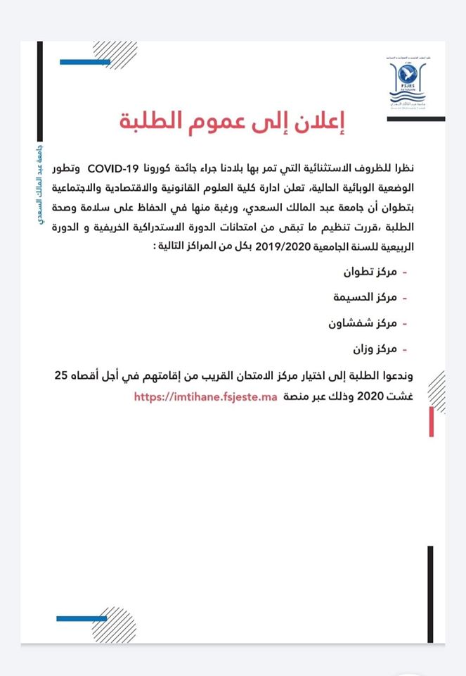 وجاء في بلاغ صادر عن إدارة الكلية المذكورة، أنه نظرا للظروف الاستثنائية التي تمر بها بلادنا جراء جائحة كورونا، وتطور الوضعية الوبائية، ورغبة من جامعة عبد المالك السعدي في الحفاظ على سلامة وصحة الطلبة، قررت تنظيم ما تبقى من امتحانات الدورة الاستدراكية الخريفية والدورة العادية الربيعية للسنة الجامعية 1019-2020 بكل من مراكز تطوان و الحسيمة و شفشاون و وزان.